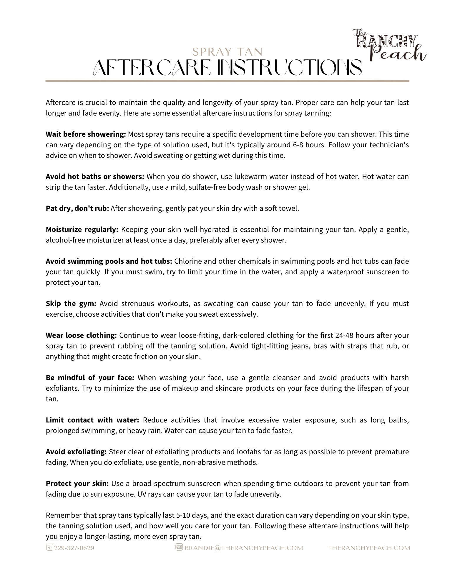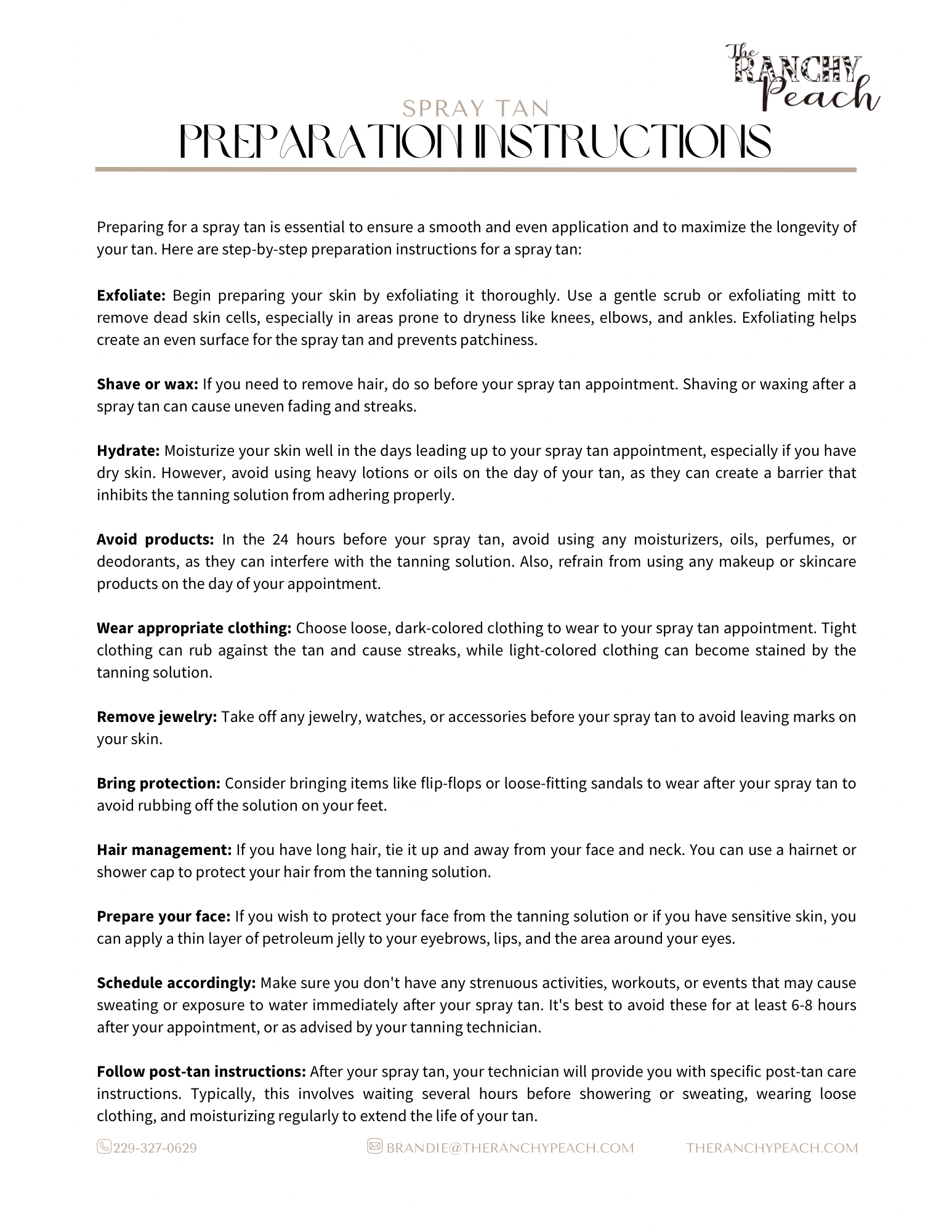 - No Guaranteed Results: Spray tan development can differ based on individual skin type, preparation, and aftercare. The Ranchy Peach does not guarantee a specific shade, depth, or longevity of the tan.