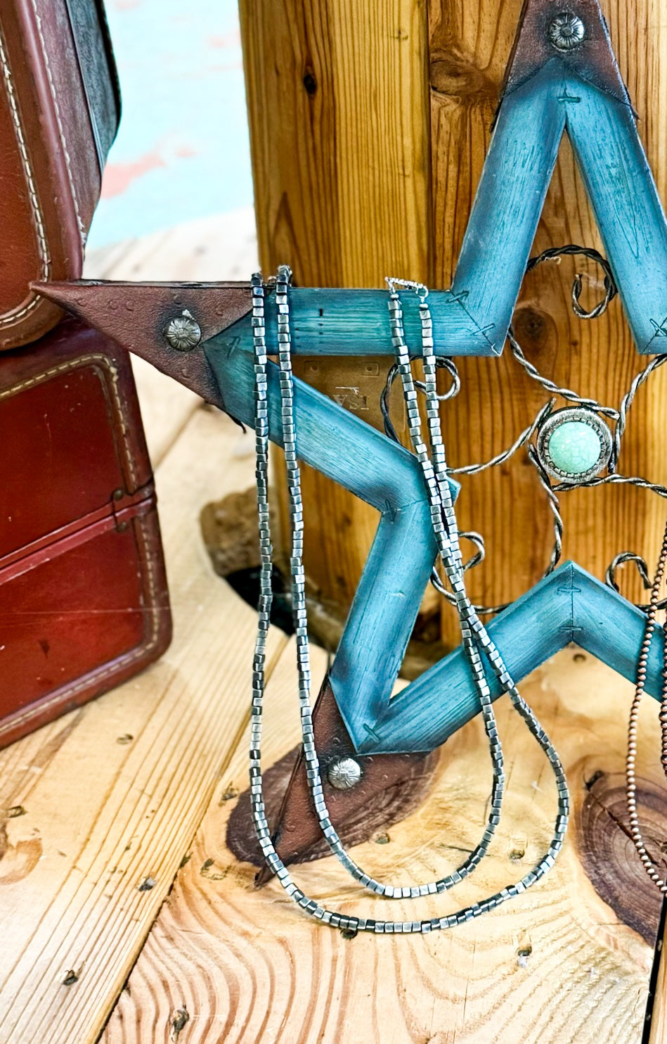 This handcrafted Square Navajo Bead Necklace features two strands of 4mm square beads, measuring between 30" and 35" in length. Its careful artistry highlights the beauty of traditional Navajo design, making it a meaningful addition to any collection. Enjoy a unique, wearable piece that supports handmade craftsmanship and timeless style.