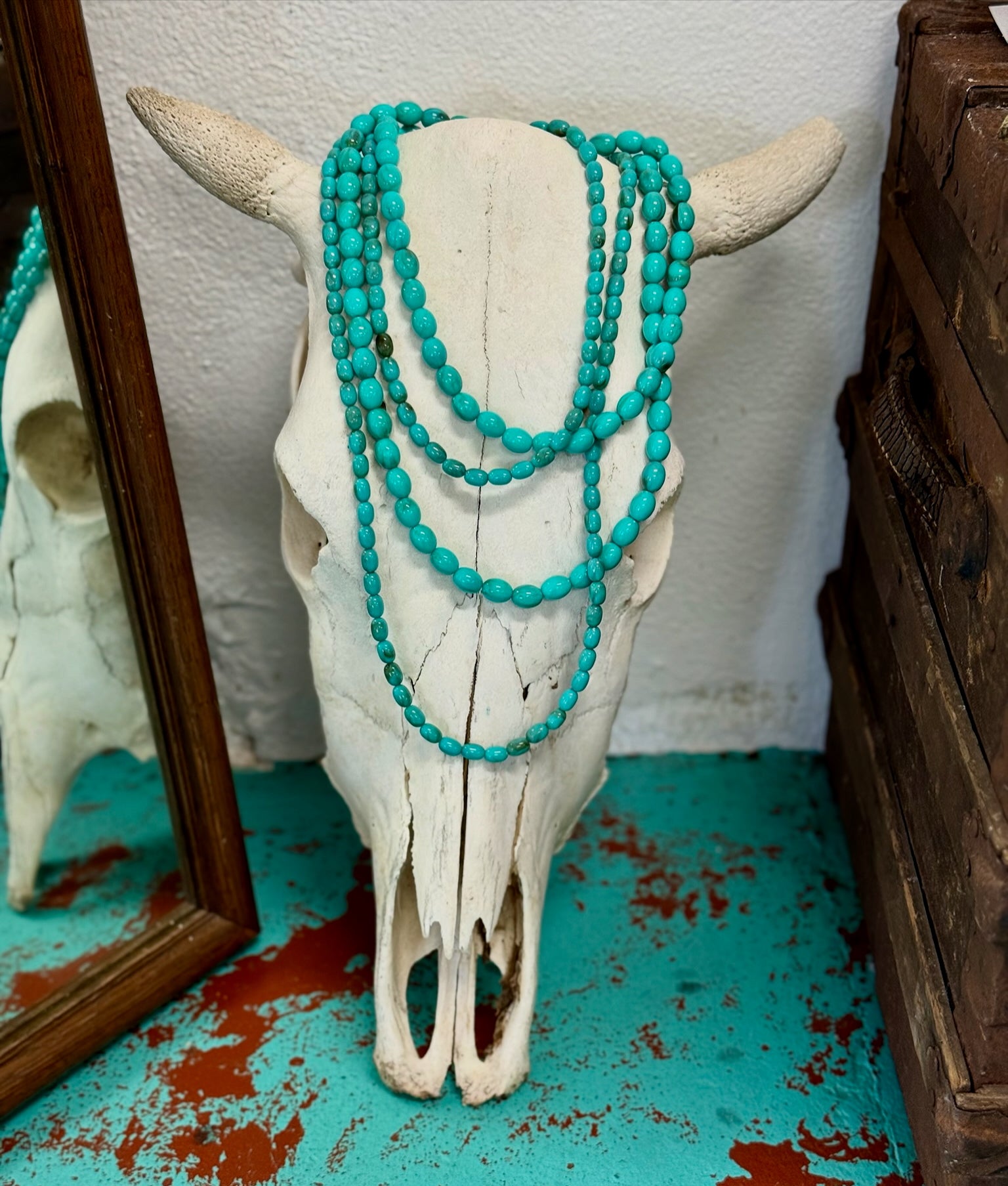 Experience timeless elegance with this handmade Western Turquoise Oval Bead Necklace, featuring two strands for a layered look. Available in 46" and 50" lengths, it offers versatile styling options and includes a 5" extender for an extra-long fit between 50" and 55". Perfect for adding a touch of southwestern charm to any outfit, this necklace combines quality craftsmanship with comfortable wearability.